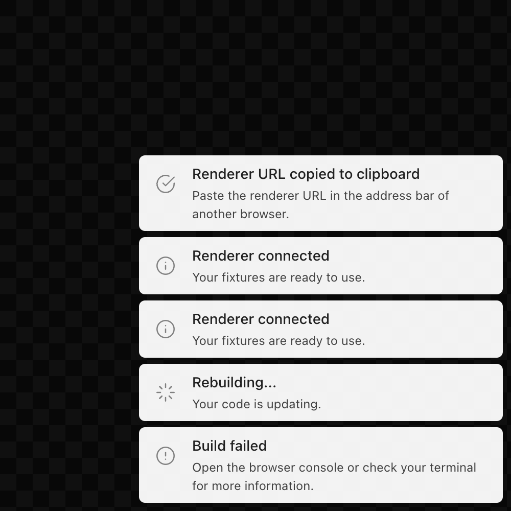 You can have multiple DOM remote renderers open simultaneously, allowing you to view the same fixture on different resolutions, browsers, or devices. It's also possible to preview different fixtures concurrently. The React Native renderer is another example of a remote renderer.