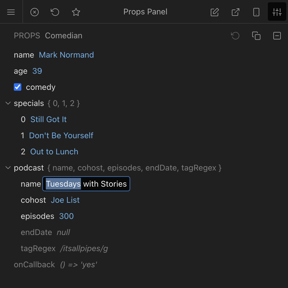 | Props | Automatically generated based on React element props. Only works with Node Fixtures. |