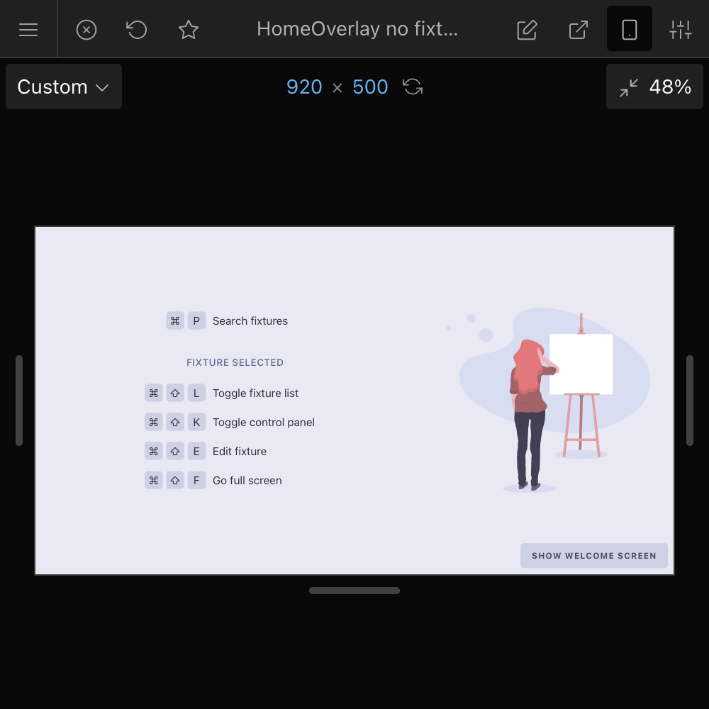 You can open a remote renderer by using the "Copy remote renderer URL" button from the home screen, or by launching a Full-Screen Preview. In the former case the renderer will follow the selected fixture from the Cosmos UI, while in the latter case the selected fixture is locked for that renderer.